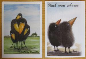 Ihre Postkarten mit Raben-Motiven flattern in ganz Deutschland herum. Natürlich sind ihre Raben seit einiger Zeit auch in Rabenau gelandet und hier beliebt. Deshalb widmet der Museumsverein der Grafikerin 2026 die Ausstellung im Kabinett, die sicher viele Menschen erfreuen wird.