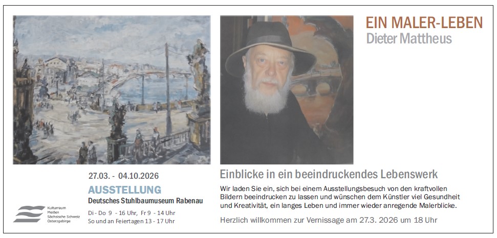Dieses große bürgerliche Engagement würdigt nun die Personalausstellung für Dieter Mattheus in der Nachbarstadt Rabenau, wo der gemeinnützige Museumsverein das Deutsche Stuhlbaumuseum betreibt. Die Hochachtung vor seiner Lebensleistung und seiner anhaltenden kreativen Schaffensperiode im reifen Alter sind guter Anlass für eine Kooperation mit dem Kunst-Kreis-Bannewitz und das Schaffen der Möglichkeiten für tiefe Blicke ins Lebenswerk eines ganz bemerkenswerten Menschen.